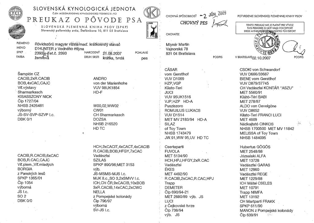 Chovný pes D'HUNTER z Vodného mlyna (C.I.E., C.I.B., ICH, GCH SR, GCH ČR, CH SR, CH ČR)