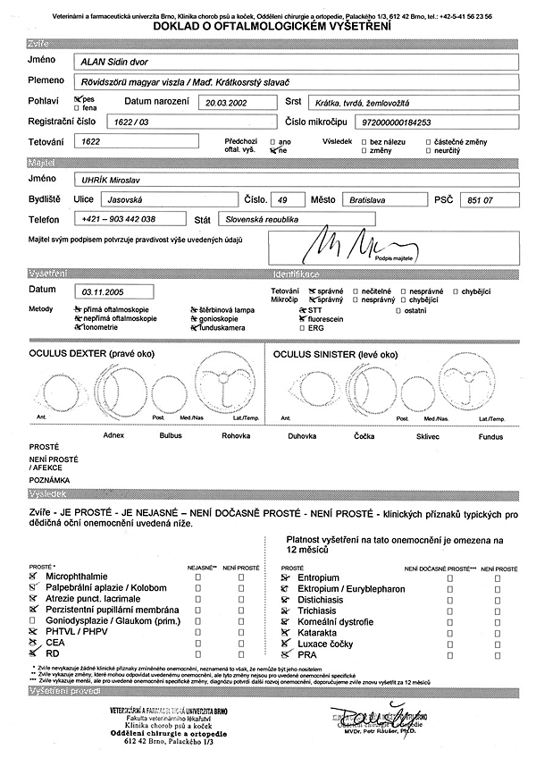 - Vyšetrenie dedičných očných vád je komplexné oftalmologické vyšetrenie podľa jednotnej diagnostiky pod gesciou ECVO (European College of Veterinary Ophtalmologosts), platné pre celú EÚ. Výsledky vyšetrenia sú zapísané do protokolu predpísaného ECVO.